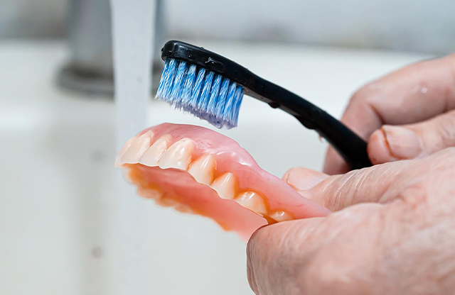 It’s best to stand over a folded towel or a sink of water when handling your denture, just in case you accidentally drop it. Brush the denture (preferably with a denture brush) daily to remove food deposits and plaque, and keep it from becoming permanently stained. Avoid using a brush with hard bristles, which can damage the denture. Look for denture cleansers with the American Dental Association (ADA) Seal of Acceptance. Pay special attention to cleaning teeth that fit under the denture`s metal clasps. Plaque that becomes trapped under the clasps will increase the risk of tooth decay.