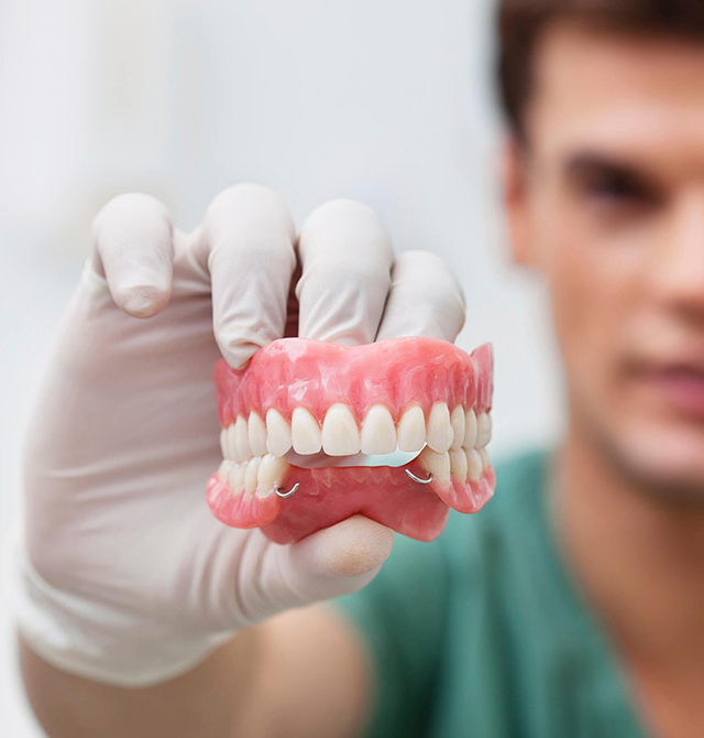 A denture is a removable replacement for missing teeth and adjacent tissues. It is made of acrylic resin, sometimes in combination with various metals.